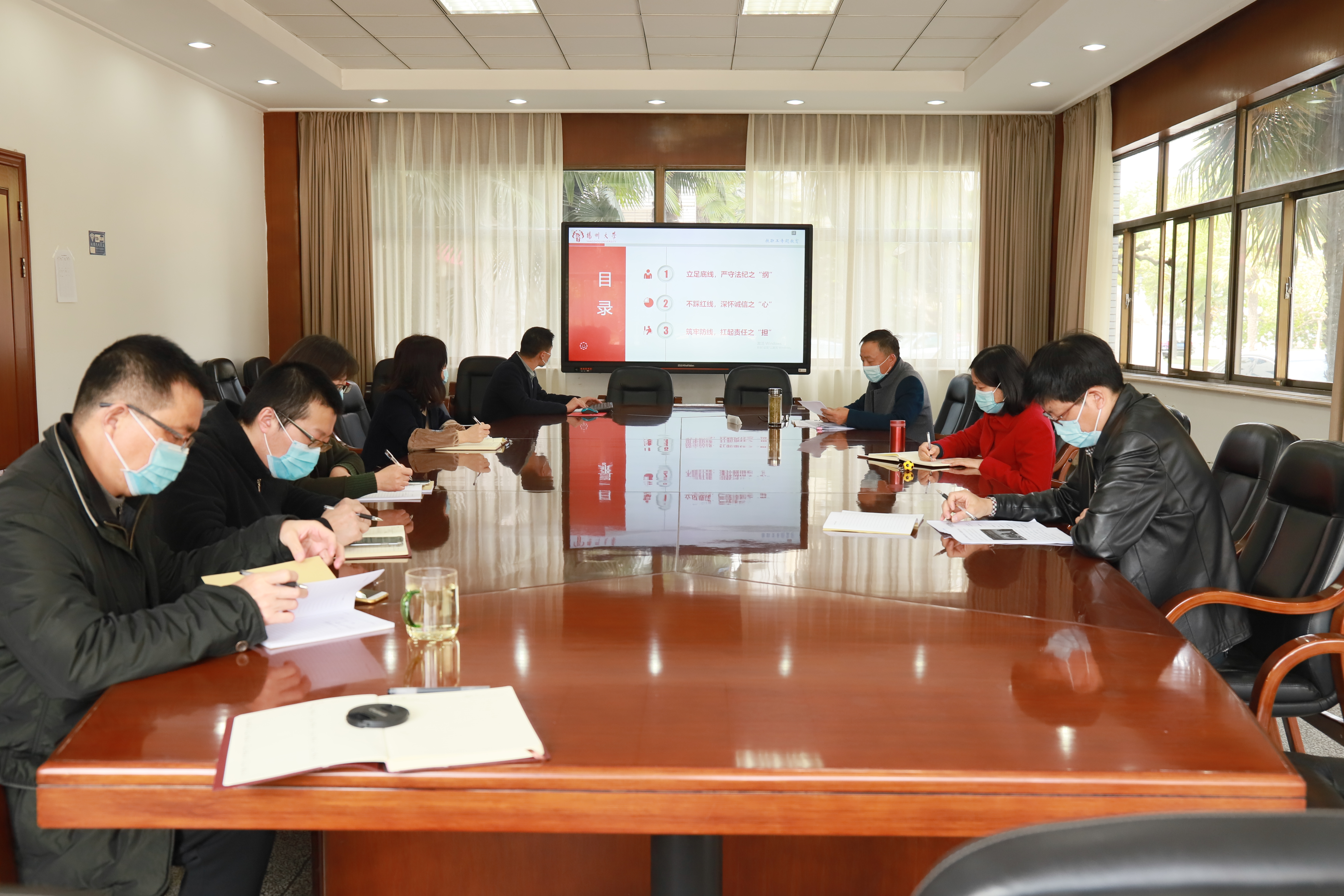 副处长、支部书记王桂林围绕“法纪•诚信•责任”主题,从“立足底线,严守法纪之‘纲’”“不踩红线,深怀诚信之‘心’”“筑牢防线,扛起责任之‘担’”三个方面做了详细讲解。常务副处长张丹要求全体教职工要严格执行学校对于疫情防控的规范和要求,要做到个人及家人疫情防控的常态化。强调在做好疫情防控的同时要积极发挥主观能动性,全力以赴做好部门2020年的各项工作。