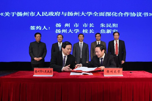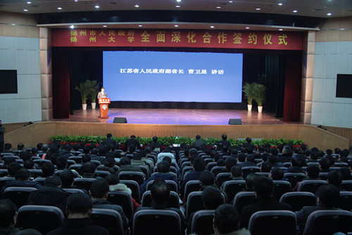 1月16日上午,扬州市人民政府与我校全面深化合作协议签约仪式在荷花池校区大学生活动中心小剧场隆重举行,市校双方共签署了《扬州市人民政府与扬州大学全面深化合作协议书》、《关于扬州市第一人民医院划转为扬州大学直属附属医院的协议书》、《关于合作共建扬州大学广陵学院的协议书》、《关于扬州大学实验农牧场地块整体处置的协议书》、《关于扬州大学现代农业科教示范园合作共建的协议书》等五项协议。副省长曹卫星、校党委书记姚冠新出席仪式并致辞,扬州市市长朱民阳、校长焦新安等代表市校双方签约,省教育厅副厅长丁晓昌等出席活动。