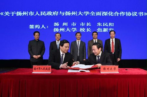 朱民阳、焦新安代表市校双方签署了《扬州市人民政府与扬州大学全面深化合作协议书》,董玉海、叶柏森代表市校双方签署了《关于扬州市第一人民医院划转为扬州大学直属附属医院的协议书》,闻道才、胡效亚代表市校双方签署了《关于合作共建扬州大学广陵学院的协议书》,闻道才、陈国宏代表市校双方签署了《关于扬州大学实验农牧场地块整体处置的协议书》,丁一、陈国宏、潘学元代表扬州市政府、扬州大学、高邮市政府签署了《关于扬州大学现代农业科教示范园合作共建的协议书》。