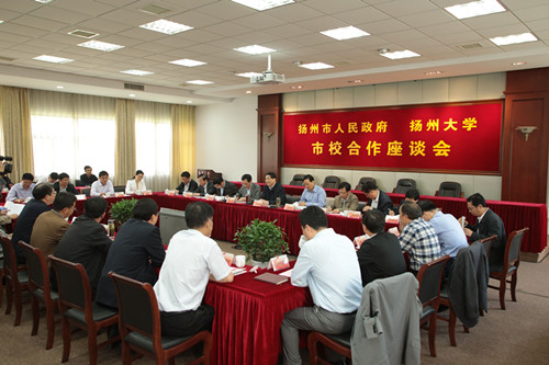 5月16日下午,学校与扬州市人民政府就进一步推进全面合作举行市校合作座谈会。扬州市市长朱民阳,副市长闻道才,校党委书记姚冠新,校党委副书记、纪委书记刘延庆,副校长黄建晔、陈国宏、洪涛出席座谈会。