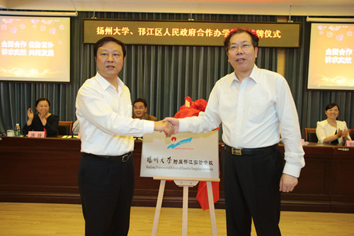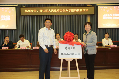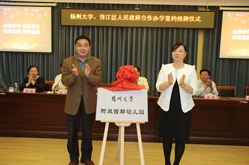 姚冠新、张耀武,黄建晔、祁胜媚,洪涛、冯筱白等先后为“扬州大学附属邗江实验学校”“扬州大学附属西郡幼儿园”“扬州大学附属泰和幼儿园”揭牌。黄建晔、洪涛分别代表学校签署“合作共建扬州大学附属邗江实验学校协议书”“合作共建幼儿园协议书”。