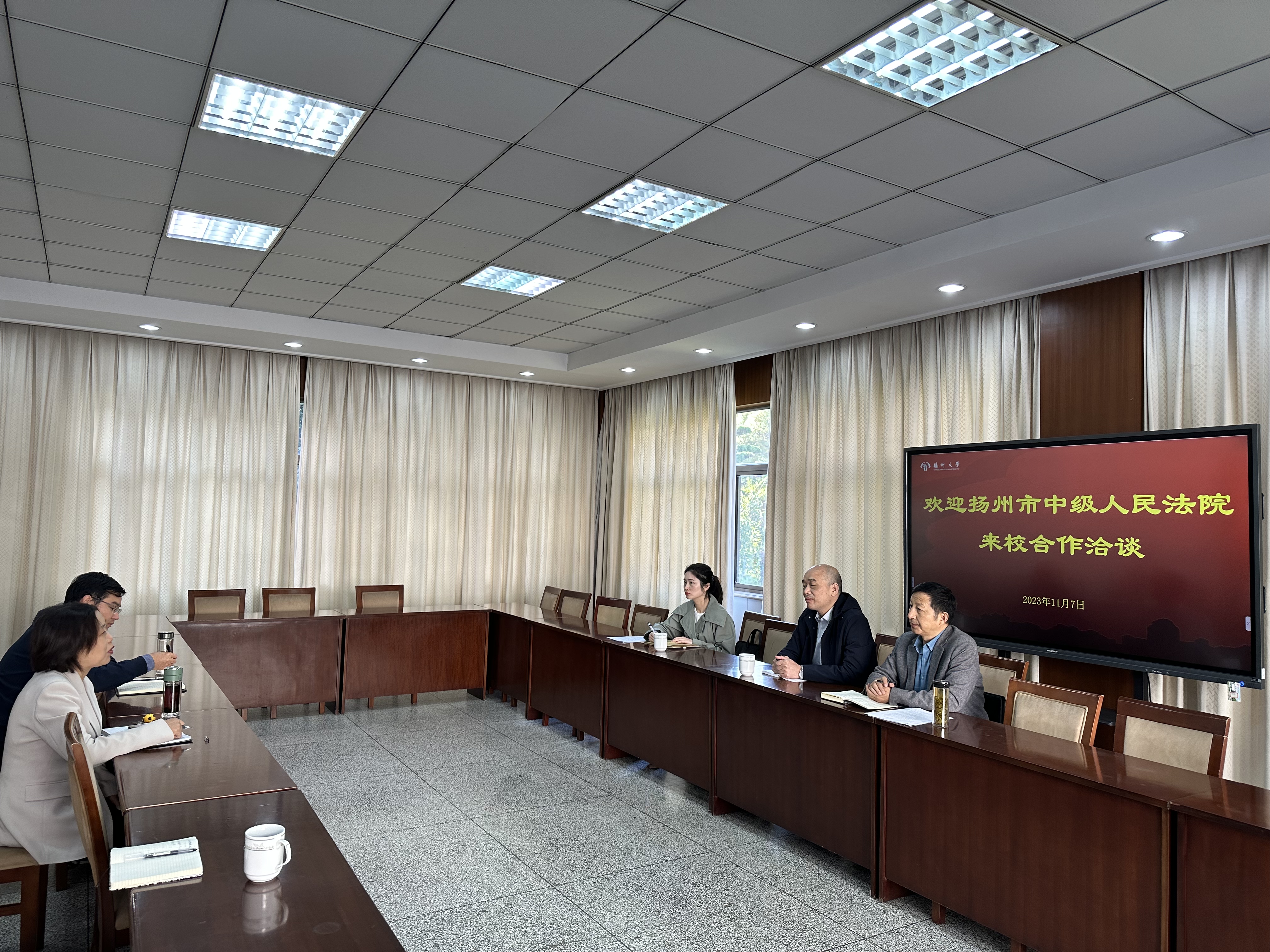 11月7日,扬州市中级人民法院政治部主任王友根,政治部副主任、教培处处长李志平,教培处副处长朱敦原来校洽谈合作,社合处处长张丹、副处长尹明涛参加洽谈。