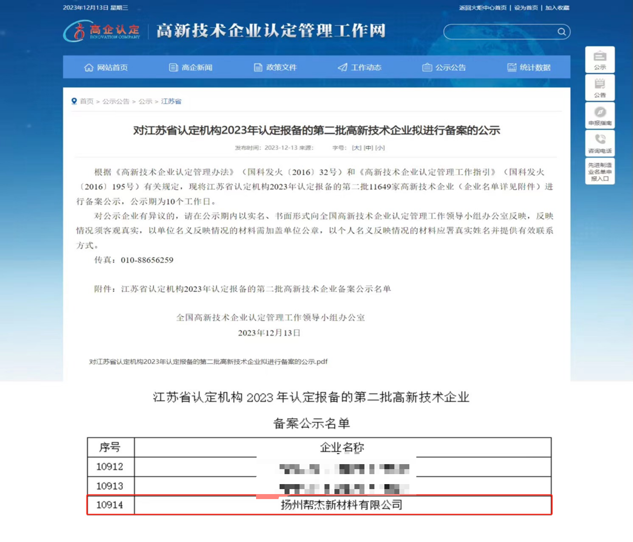 12月13日,全国高新技术企业认定管理工作领导小组办公室公布“江苏省认定机构2023年认定报备的第二批高新技术企业备案公示名单”,大学科技园在园孵化企业扬州帮杰新材料有限公司顺利通过国家高新技术企业审核。