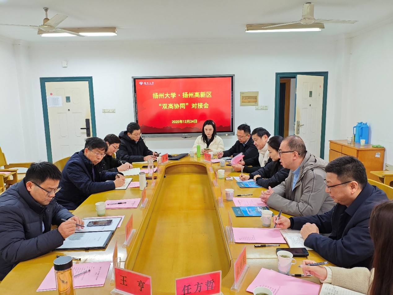 12月24日,扬州高新区科学技术和知识产权局来校调研交流,产业处处长庞欢、副处长章小卫参加活动。