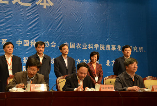 5月9日,焦新安校长应邀出席2014中国蔬菜产业大会暨中国蔬菜产业博览会。会上,焦新安校长代表学校,与常熟市人民政府签署校地全面合作及定向培养基层农业农村人才两份协议。