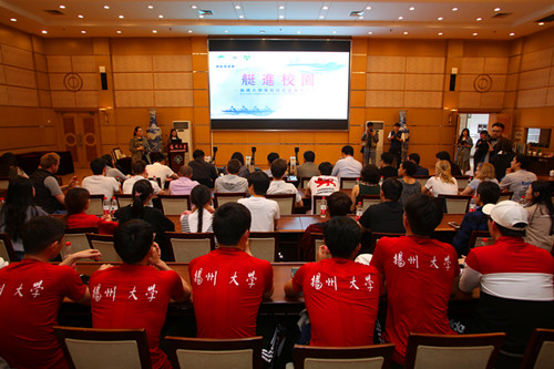 剑桥大学赛艇队队长HugoVentham分享了剑桥学生眼中的赛艇运动以及剑桥赛艇队员的日常训练生活,他表示非常荣幸能带领队员们来扬州大学做客,希望能与中国大学生一起努力宣传、推广赛艇运动。