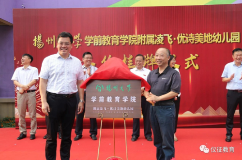 胡学春书记与尤玉军副市长为扬州大学学前教育学院附属优诗美地幼儿园揭牌。
