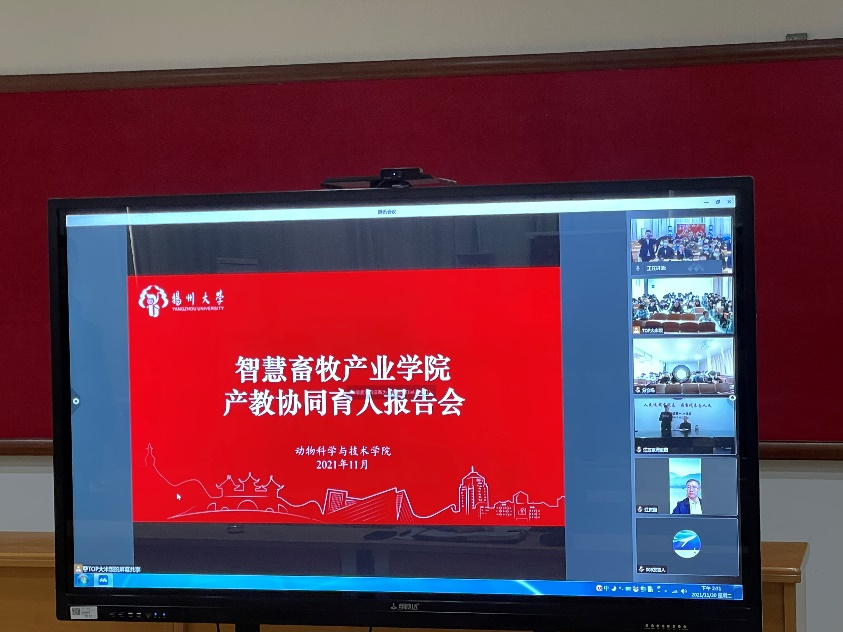 为更好地发挥智慧畜牧产业学院作用,积极推进专业与企业特色资源之间的有效整合,共同拓展专业人才培养空间,构建新型专业建设和人才培养模式,打造专业特色,近日,动物科学与技术学院特邀优秀企业家——江苏京海禽业集团顾云飞董事长、大连三仪集团江庆国副董事长和南京卫岗乳业有限公司牧业公司田雨总经理等,采用线上和线下相结合方式,就“探索校企联合人才培养新模式和产教协同育人新机制”与师生进行了探讨交流。