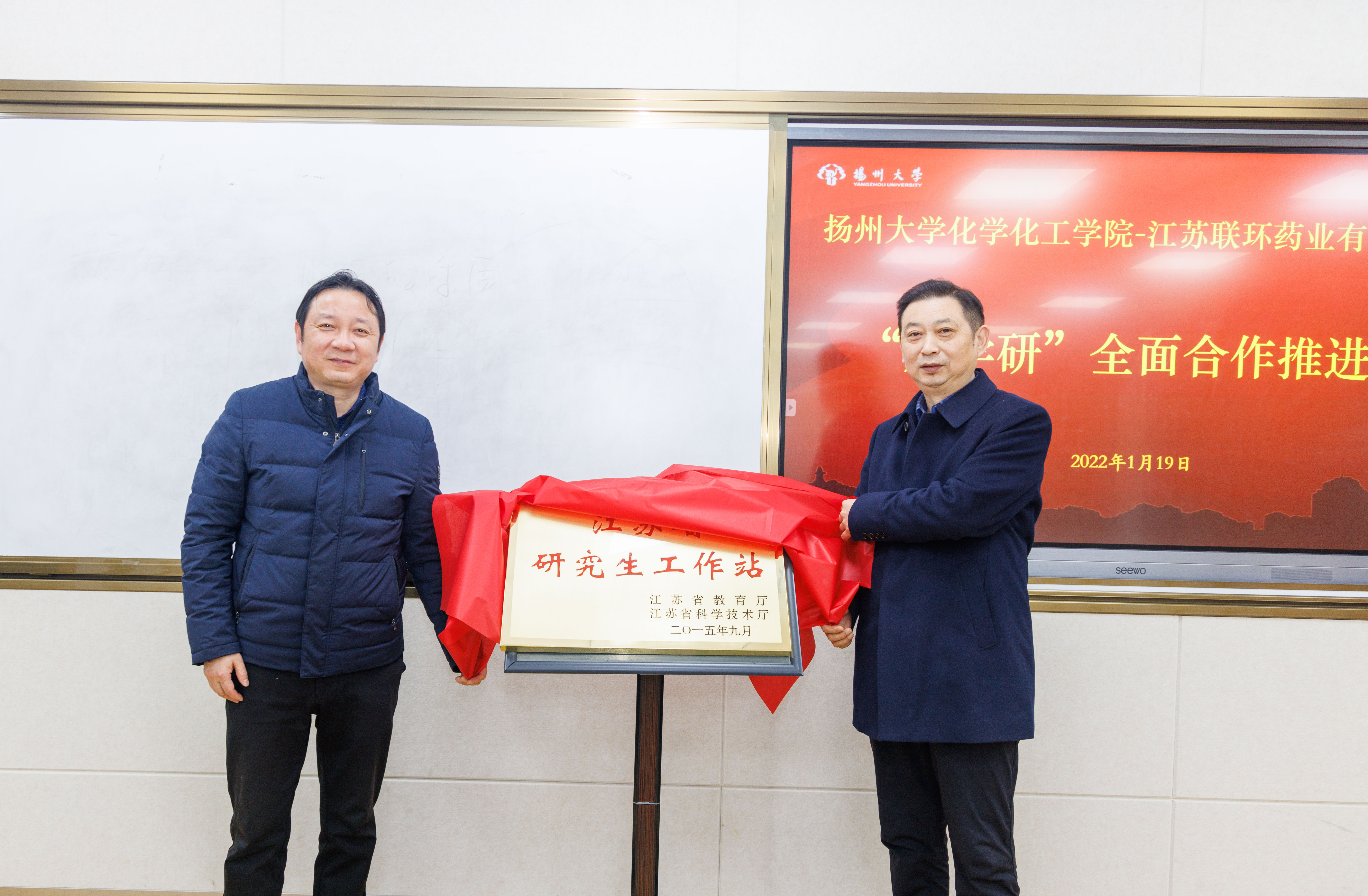 推进会上,双方签订了全面合作协议、研究生联合培养协议、设立联环药业奖学金协议;共同为江苏省企业研究生工作站、联环药业实习实践基地揭牌。
