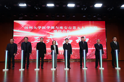 12月9日,医学部与淮安市第五人民医院深化合作协议签约仪式在淮安举行。副校长龚卫娟,淮阴区委副书记、区长陈张出席仪式并致辞。淮阴区委常委、宣传部部长李冬生,淮阴区卫健委党委书记、主任吴洪乐等出席签约仪式。