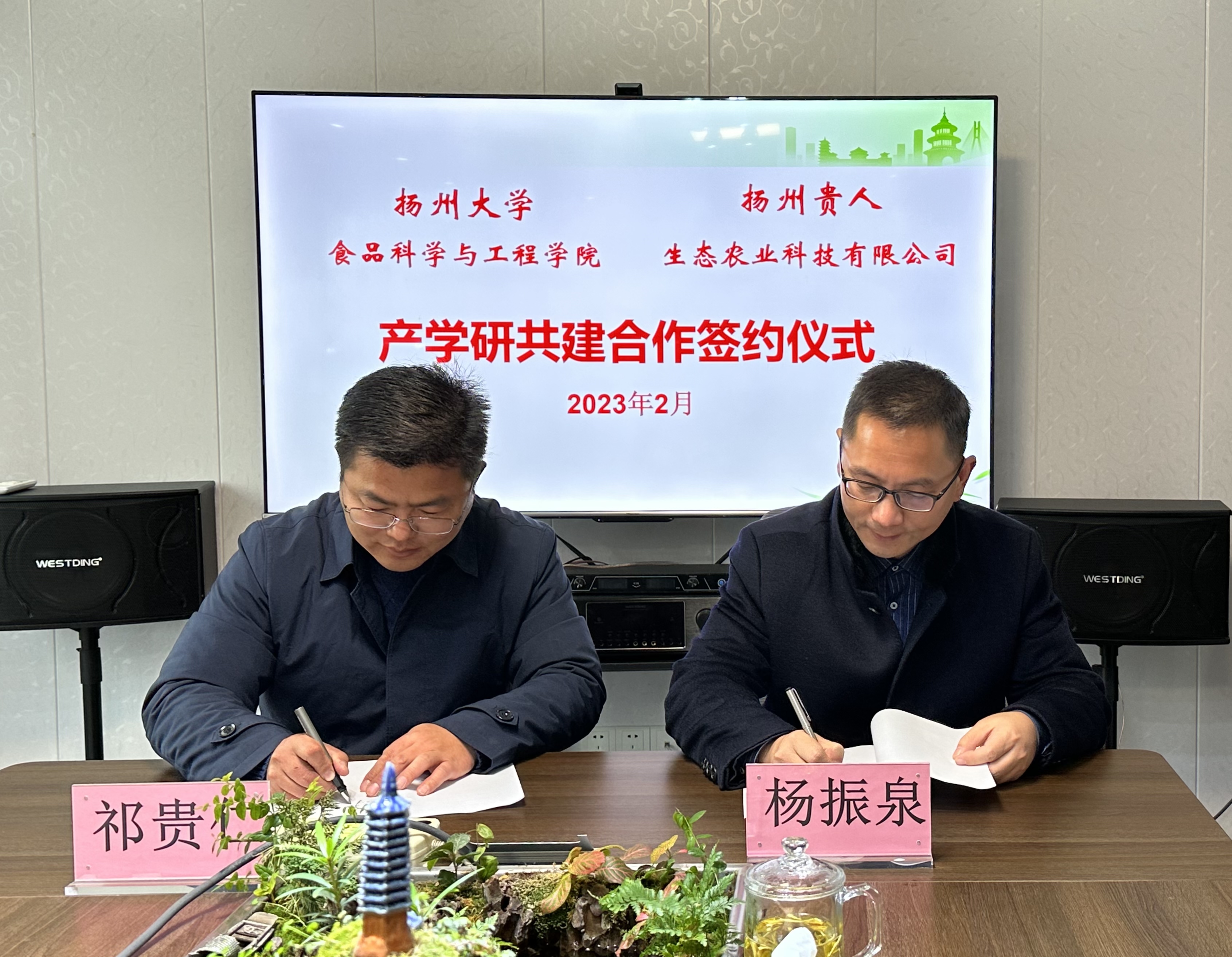 活动仪式上,戴世勇、杨振泉分别致辞,并为“扬州大学食品科学与工程学院产学研基地”揭牌。杨振泉院长代表扬州大学食品科学与工程学院与贵人生态农业科技有限公司签订《产学研合作协议》。