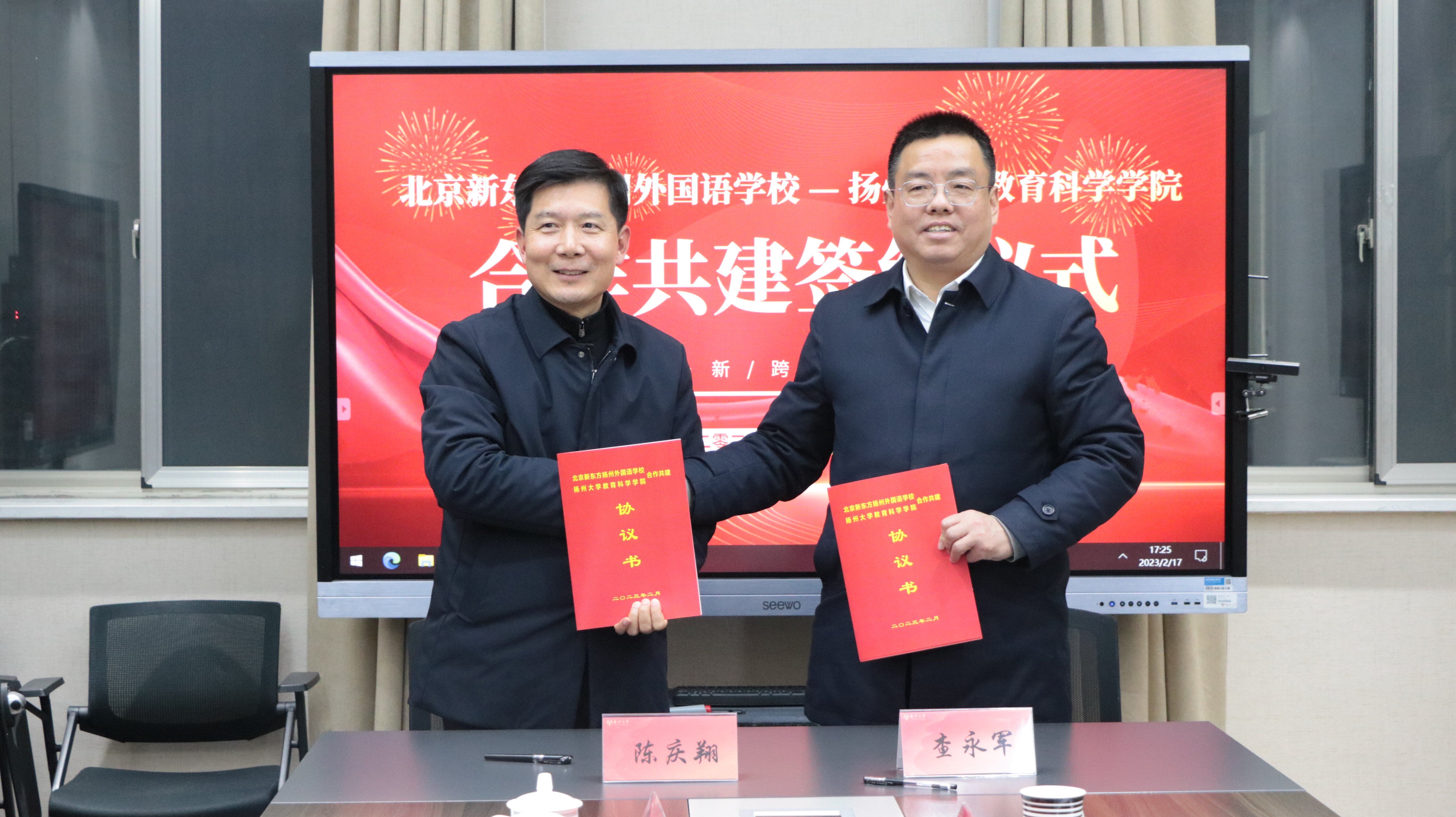 为了加强对外交流合作,促进高校与基础教育的合作双赢,2月17日下午,扬州大学教育科学学院(师范学院)学前教育学院与北京新东方扬州外国语学校于教科楼成功举行了合作共建签约仪式。会议由院党委书记杨咏主持,北京新东方扬州外国语学校校长陈庆翔、副校长沙庆仁、教学研究室(课程中心)主任易文胜、教学研究室(课程中心)主任助理陆金虎、人力资源部丁广琴以及小学双语年级组长刘玉艳,院长查永军、副院长曹玉兰等出席本次签约仪式。