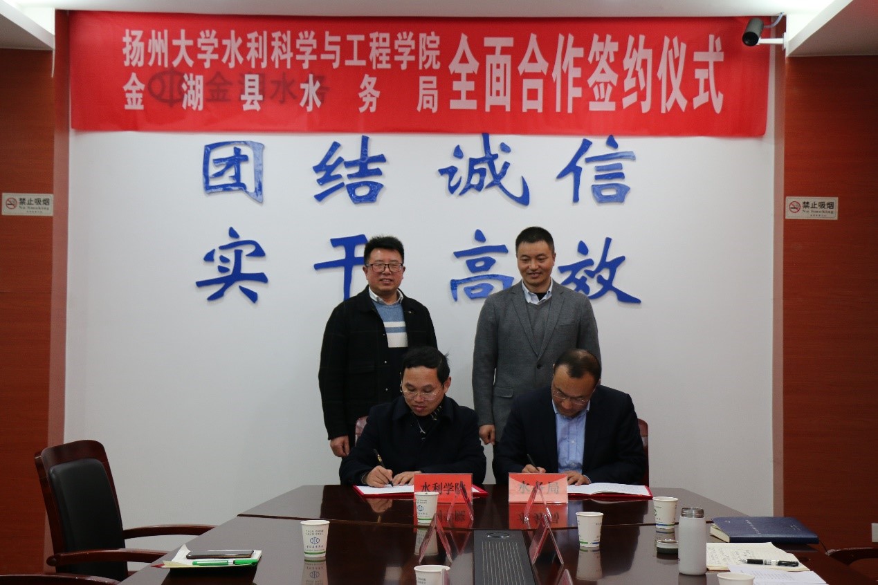 2月27日下午,水利科学与工程学院与金湖县水务局举行全面合作协议签约仪式。金湖县副县长顾海芸,金湖县科技镇长团团长、副县长丁海峰,院党委书记王建军,院长成立,副院长张海翎,金湖县水务局党委书记、局长李卫兵和全体局领导出席活动。成立和李卫兵代表双方签约。