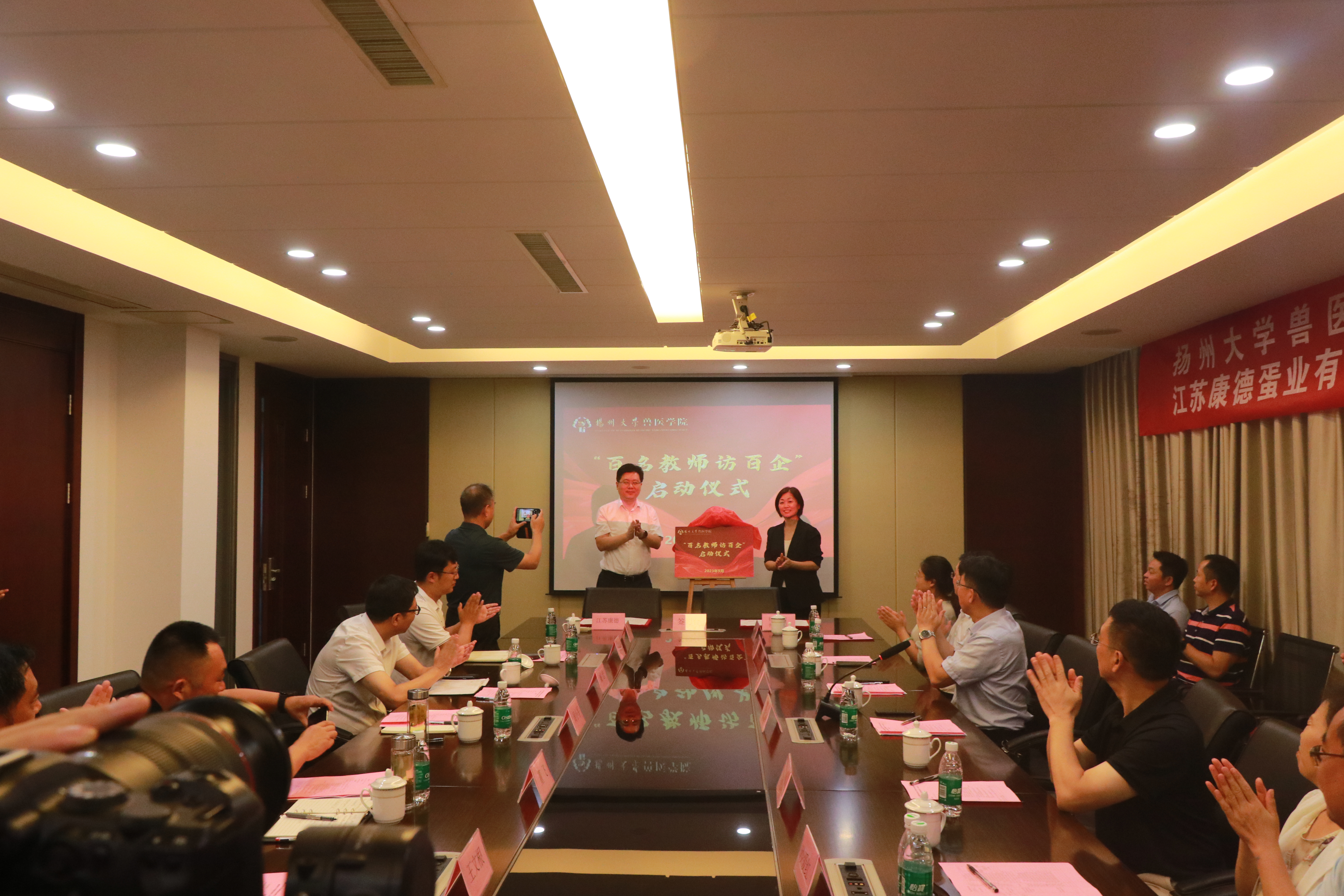 随后,周小军和蔡丽娅共同为扬州大学兽医学院“百名教师访百企”行动启动仪式揭牌,王志强与王文根共同签订校企产学研战略合作协议、秦涛与王俊伟为产学研合作基地和实践教学基地签约并授牌,王文根向学院青年教师郭梦娇副教授颁发“科技副总”聘书。最后,吴艳涛教授作表态发言。