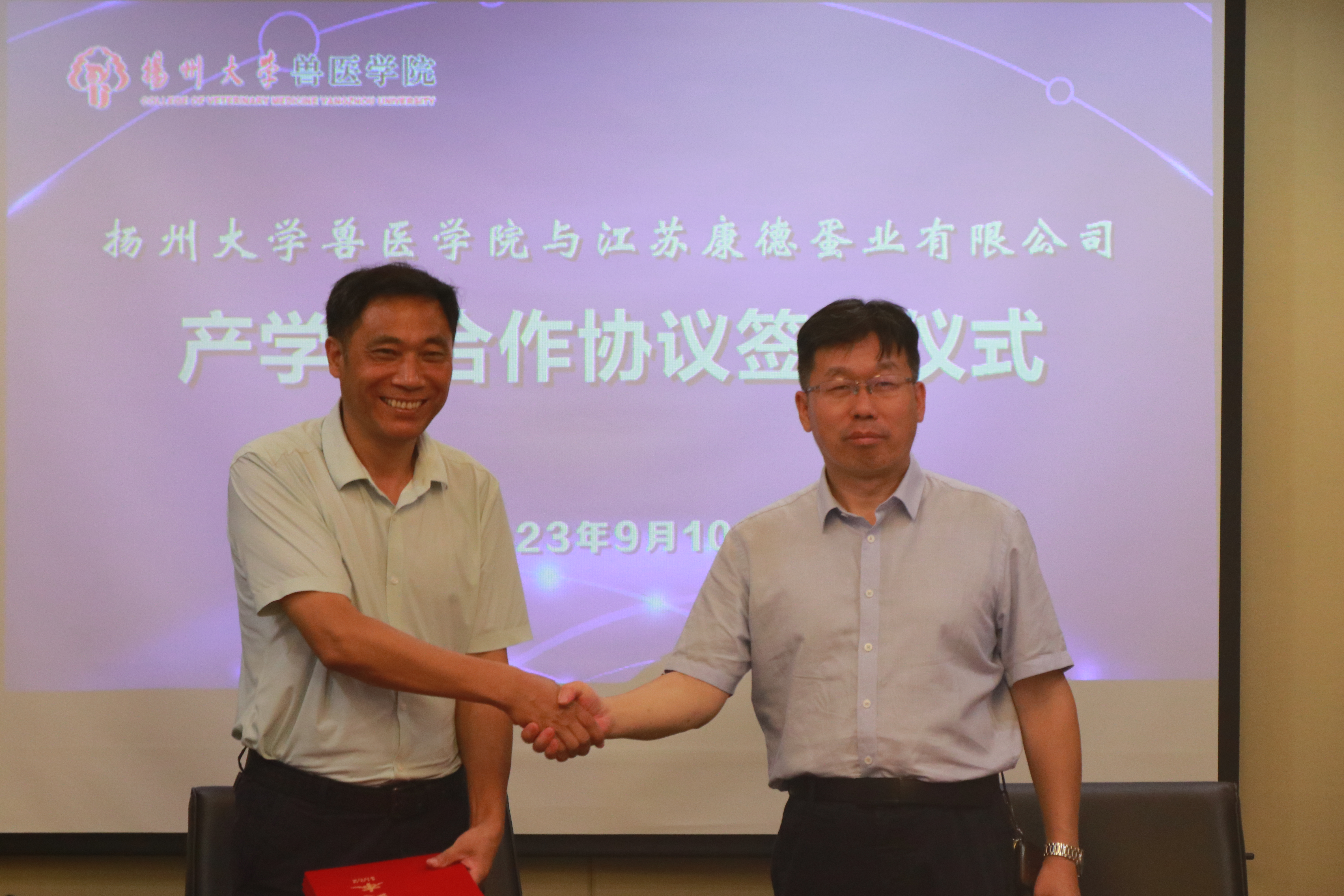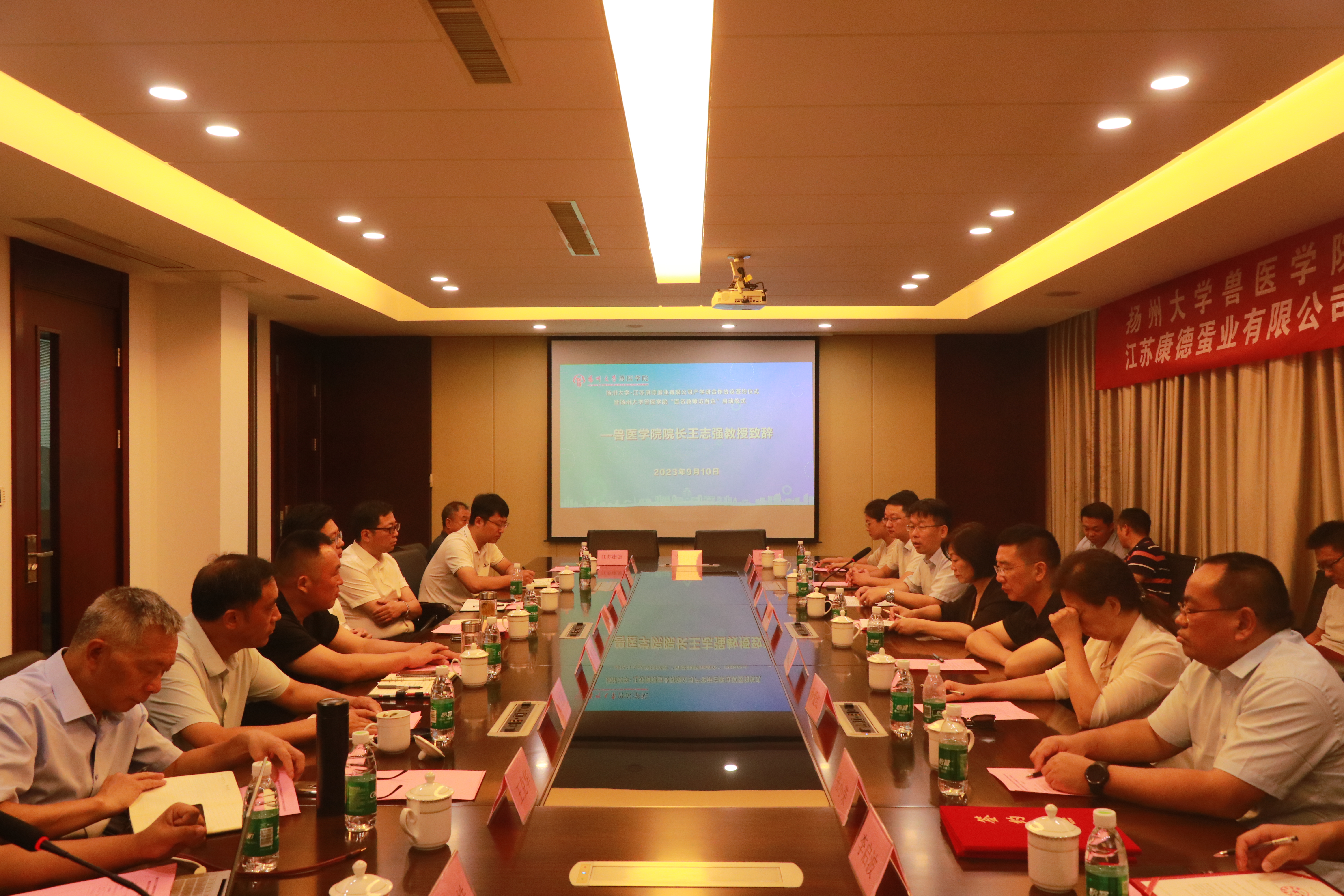 9月10日,兽医学院与江苏康德蛋业有限公司举行产学研合作协议签约仪式暨兽医学院“百名教师访百企”启动仪式。海安市人民政府副市长周小军、农业农村局局长臧忠、副局长董飞、江苏康德蛋业有限公司董事长王文根、总经理王俊伟、学院党委书记蔡丽娅、院长王志强、副书记沙爱红、副院长秦涛、国家蛋鸡产业技术体系疾病防控研究室主任、国家蛋鸡产业技术体系“一县一业”示范县(海安市)工作组副组长吴艳涛教授等其他企业代表和学院青年教师代表等30余人参加活动。