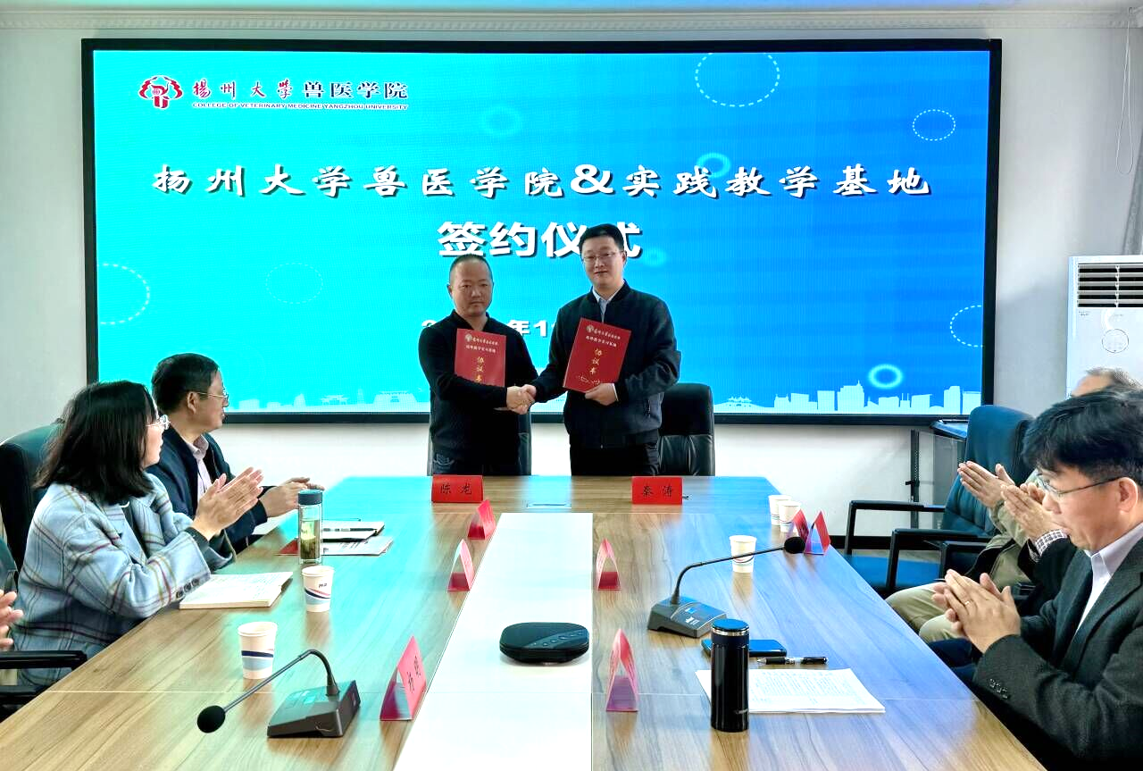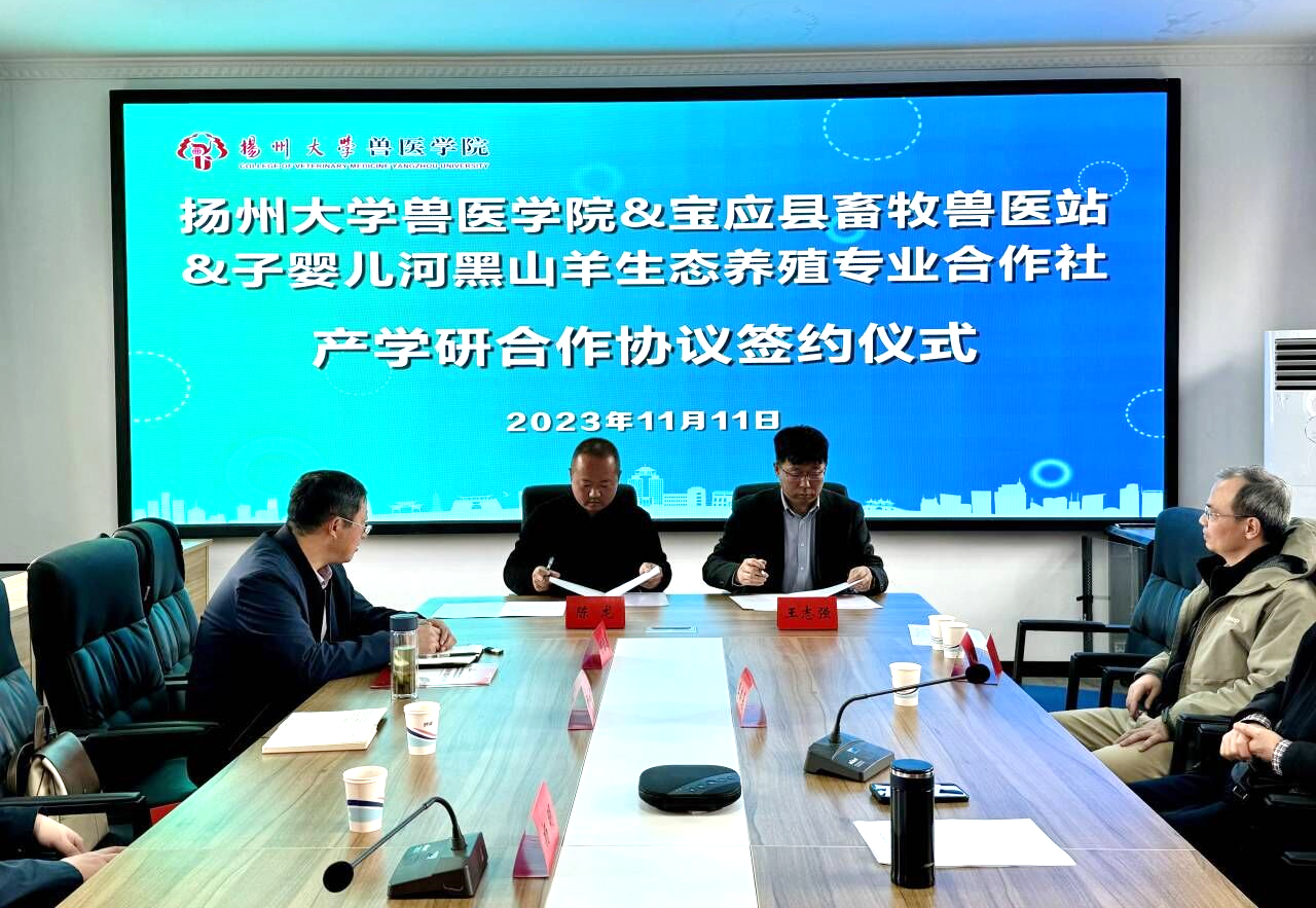 兽医学院与宝应县畜牧兽医站/子婴河黑山羊生态养殖专业合作社产学研合作协议签约仪式暨扬州大学兽医学院“百名教师访百企”活动的成功举办,是学院与企业产学研共建的创新举措,为深化校企协作,深挖企业发展需求,解决转型升级难题,促进双向协同创新具有重要意义。