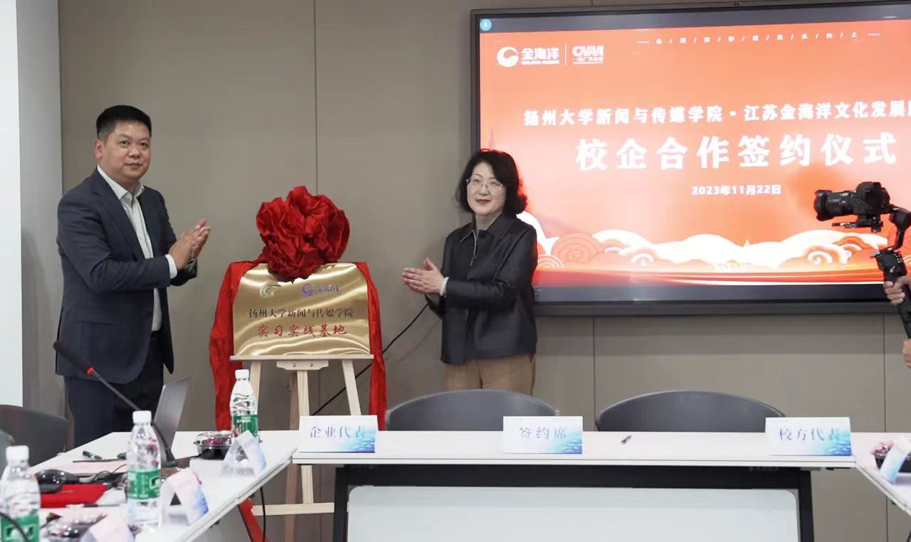 江苏金海洋互动城市文化发展股份有限公司董事长于海洋、媒介事业部总经理李静、全案事业部总经理王小丽、副总经理陈海清、行政总监纪哈杨等参加共建活动。校企双方就新媒体行业发展趋势、产学研用一体化、人才培养的产业导向、学生实习见习及岗位聘用等问题深入交换了意见。