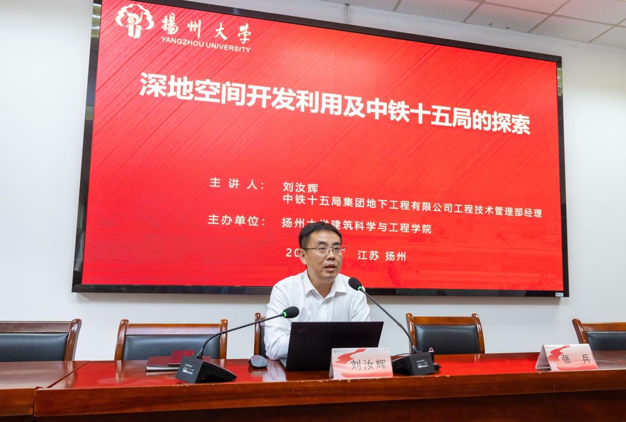 活动期间,校企双方共同签署了党建共建协议、产学研合作框架协议,学院为中铁十五局集团地下工程有限公司党委书记、董事,宁扬城际总承包部总经理、党工委副书记李建旺颁发扬州大学兼职教授聘任证书,为中铁十五局集团地下工程有限公司授牌“实践教学基地”。共建仪式后,校企双方就具体合作事项及细节展开了座谈交流。中铁十五局集团地下工程有限公司工程技术管理部经理刘汝辉为全体研究生作了题为《深地空间开发利用及中铁十五局的探索》的报告。