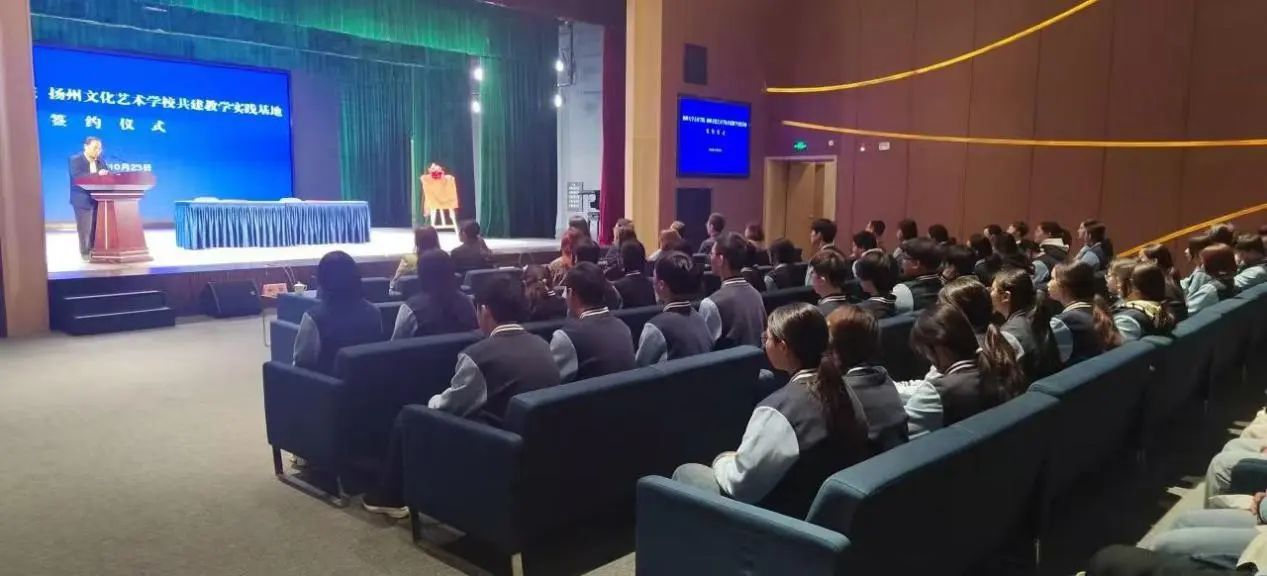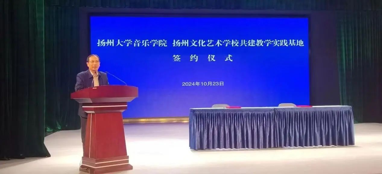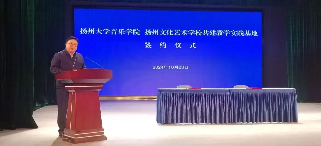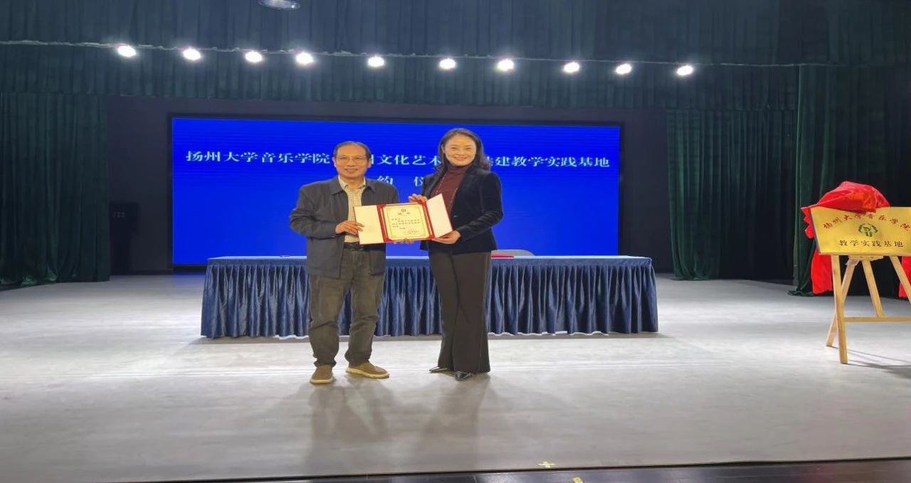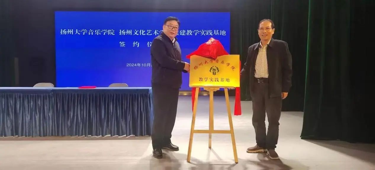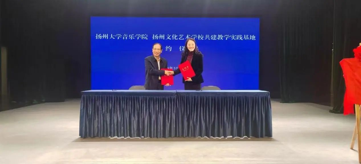 10月23日,本着“优势互补、资源共享、互惠双赢、共同发展”的原则,为音乐学院的学生探索教学实践提供桥梁。“扬州大学音乐学院&扬州文化艺术学校”签约暨授牌仪式在扬州文化艺术学校戏曲园四楼小剧场成功举行。音乐学院党委书记房东升、院长邵萍、副院长姚霆、理论教研室主任陈灏;扬州文化艺术学校党支部书记、校长殷德平,副书记、副校长周雪峰,副校长王蓓蓓、副校长姚敏、音乐科主任吴晓波及教师和学生代表参加了签约仪式。仪式由姚敏主持。