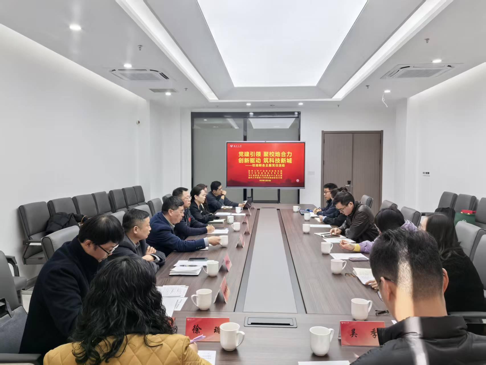 12月16日,校产业技术处党支部联合邗江科技局机关党支部、邗江高新技术创业服务中心党支部、扬州高新区扬大科技园创客党支部共同开展“党建引领聚校地合力,创新驱动筑科技新城”校地联合主题党日活动。各支部书记及支委、校产业技术处、邗江区科技局全体负责人参加主题党日活动。